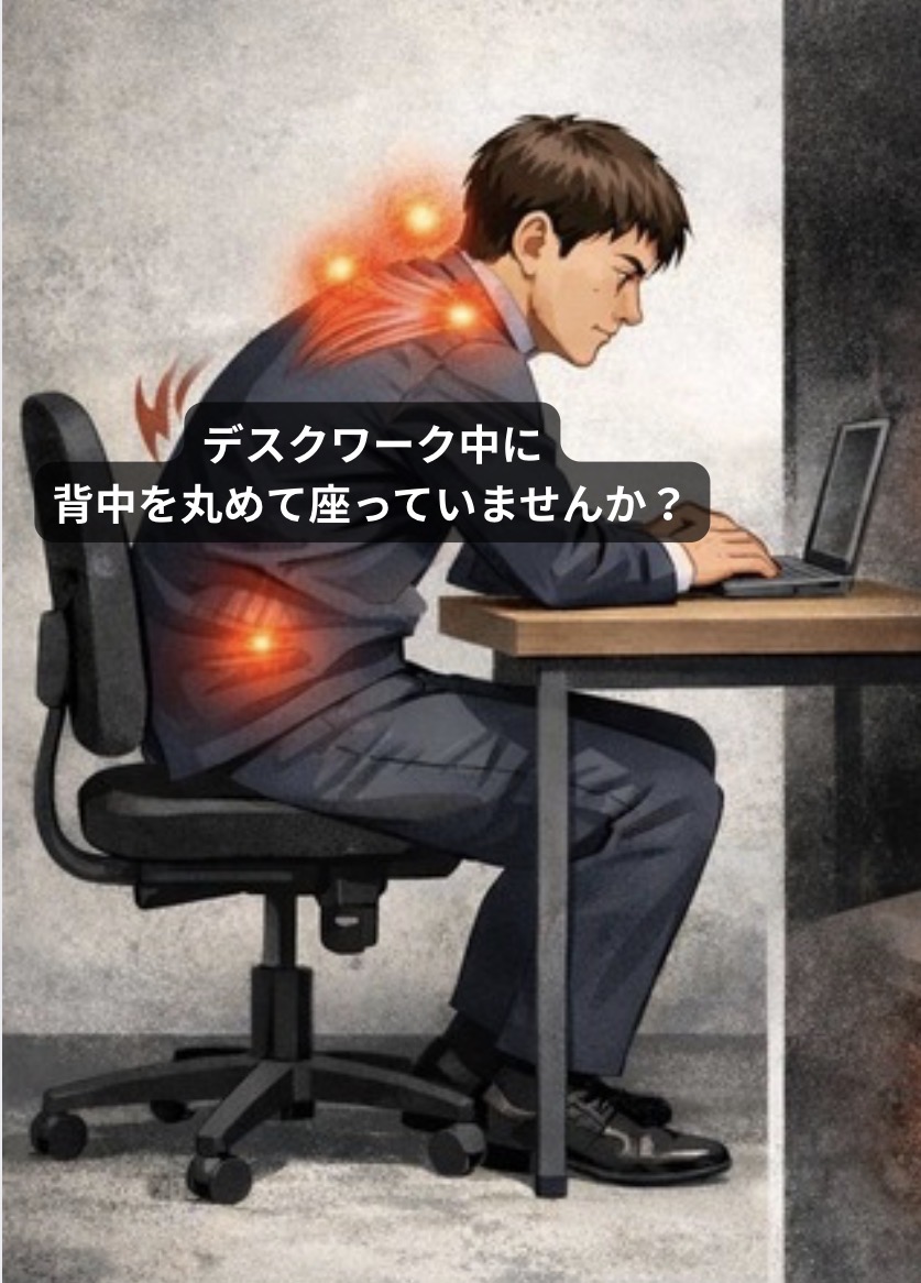 その姿勢は骨盤が後ろに倒れる「骨盤後傾」を招き、猫背や巻き肩へとつながります。